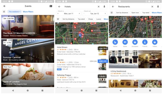 È stata aggiunta anche l’opzione per filtrare gli eventi in base al periodo (oggi, domani, weekend, settimana, mese). È possibile inoltre effettuare una ricerca in base alla categorie, seguirli e condividerli. Non manca la possibilità di cercare hotel, indicando i giorni di check-in e check-out, o ristoranti, scegliendo in base alla distanza, ai voti ottenuti o altri parametri. Al momento non sono attive le altre funzionalità annunciate al Google I/O, come Your Match e Shortlist.