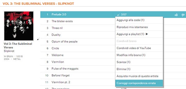 Si tratta di un problema già riscontrato in passato con i servizi concorrenti messi a disposizione da Apple e Amazon, corretto in tutta fretta, quindi è piuttosto probabile che anche Google farà lo stesso. Nel frattempo è possibile ricorrere a un rimedio temporaneo, a dire la verità piuttosto macchinoso per chi ha utilizzato scan and match per centinaia di canzoni. Questo consiste nel fare click sulla piccola freccia nera che compare a fianco di ogni traccia e selezionare l’ultima voce, “Correggi corrispondenza esatta”, come ben visibile dall’immagine seguente.