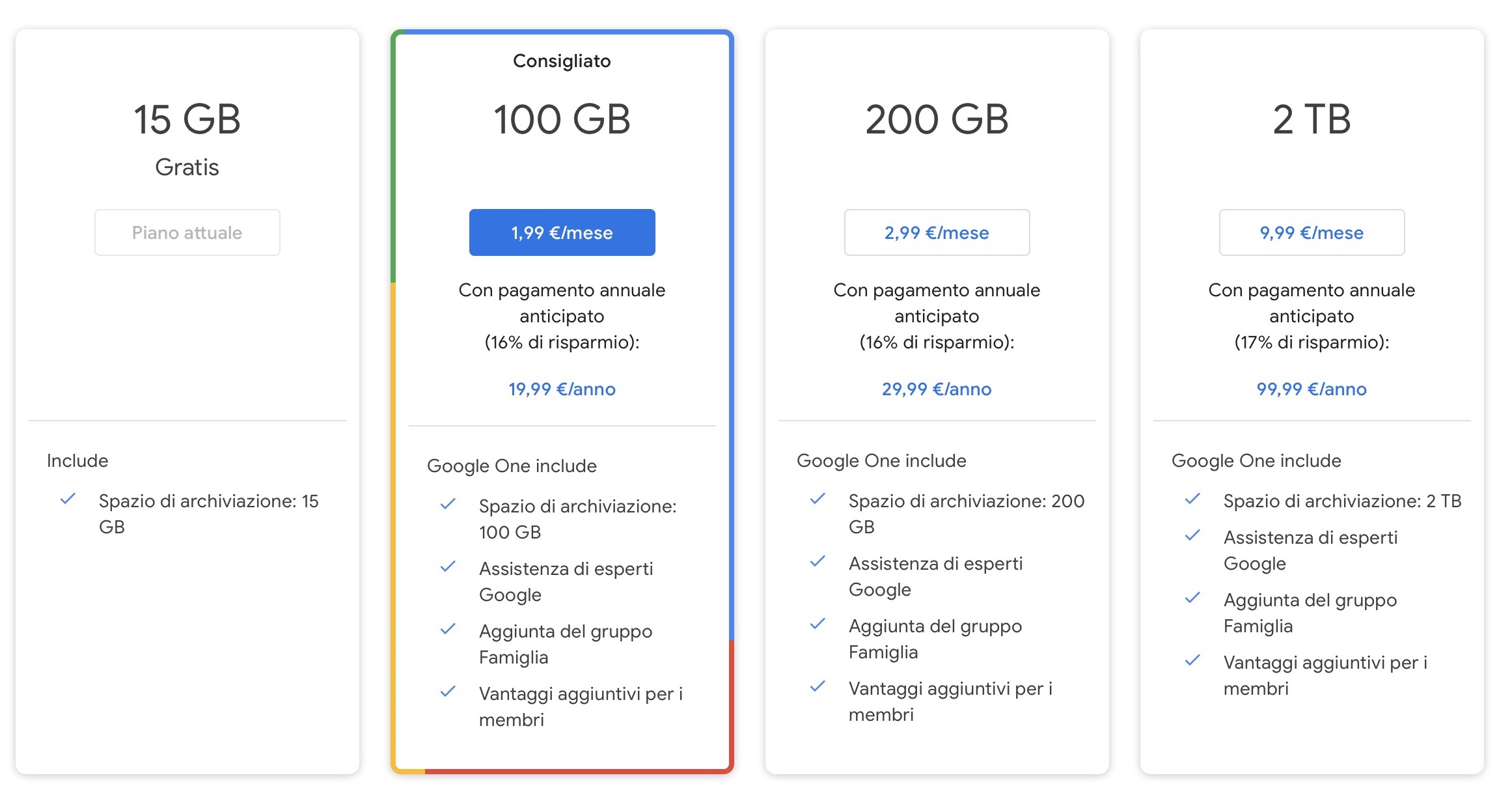 È ovviamente disponibile la possibilità di aggiungere spazio a pagamento – 100 GB a 1,99 euro al mese, 200 GB per 2,99 euro al mese e 2 TB al prezzo di 9,99 euro al mese – e probabilmente Google conta molto su questo, considerato anche lo spazio minimo disponibile ormai sui dispositivi, anche nelle loro versioni più economiche che generalmente partono da 64 GB di spazio.