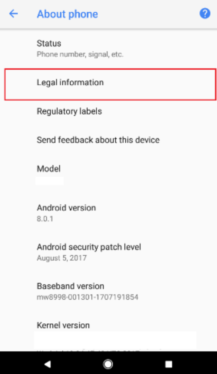 L’immagine indica la possibilità di attivare il Google Assistant, ma quasi certamente l’utente potrà scegliere altre applicazioni. Active Edge non sarà quindi un’esclusiva del Pixel 2 XL, ma i sensori di pressione verranno integrati anche nel modello più piccolo. Dalla documentazione si possono ricavare altre informazioni interessanti, come la dimensione dello storage e la versione del sistema operativo: Pixel 2 ha 64 GB di memoria flash (primo screenshot) e Android 8.0.1 O (secondo screenshot).