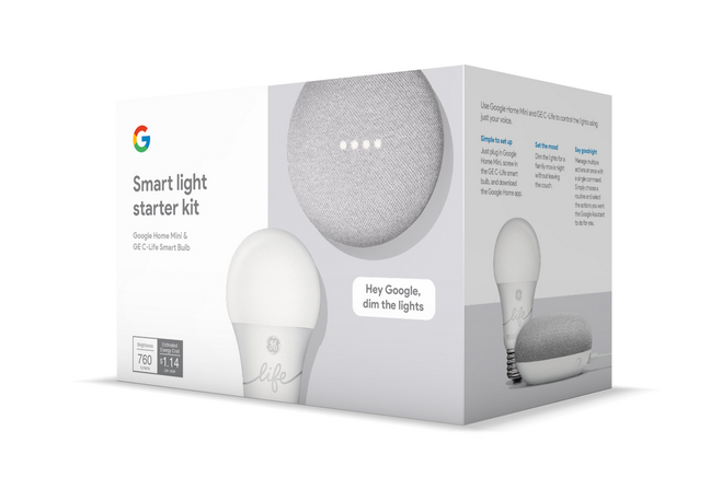 Per quanto riguarda la lampadina smart, Google la vende in un bundle denominato Smart light starter kit che contiene al suo interno un Google Home Mini e, appunto, una lampadina intelligente C-Life prodotta da General Electric. Quest’ultima può essere controllata tramite connessione bluetooth con Google Home Mini.