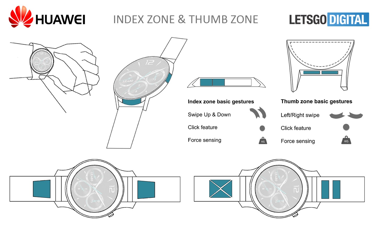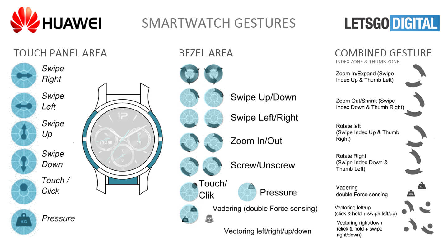 Gli smartwatch hanno uno schermo di piccole dimensioni che non consente la visualizzazione delle varie funzioni. Per evitare di toccare il display, Samsung usa una ghiera girevole, mentre Apple usa una corona touch. La maggioranza dei produttori sfrutta uno o più pulsanti tradizionali. Sui futuri modelli di Huawei potrebbero essere implementati i brevetti che prevedono aree touch sulla ghiera che circonda lo schermo. Il primo descrive il funzionamento di due pulsanti, sensibili alla pressione, posizionati sui bordi destro e inferiore della cassa.