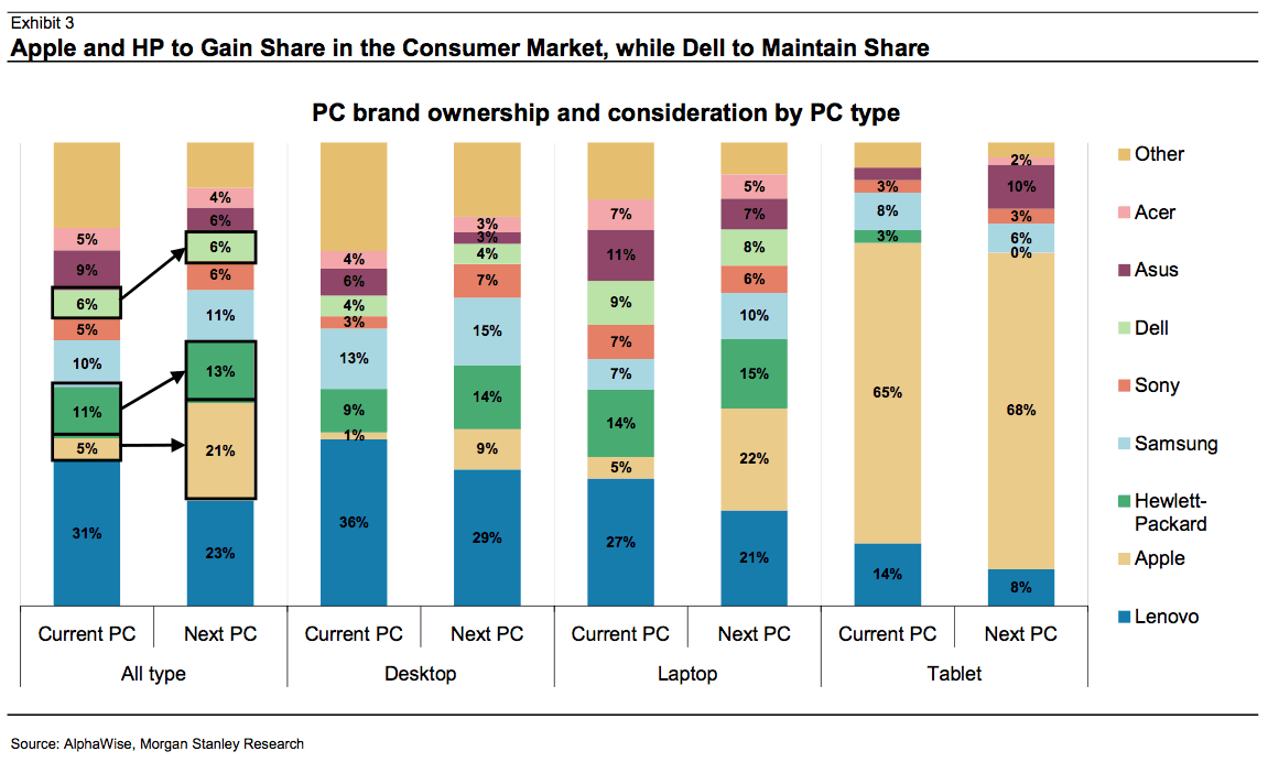 Allo stesso modo, Hewlett-Packard, che detiene attualmente l’11%, può arrivare in futuro ad un 13%. Perde margine di crescita Lenovo che, dal 31% attuale, potrebbe subire una decrescita fino al 23% sulla base della crescente concorrenza in entrata. Rimane in stallo Dell, ferma al 6%. A sottolineare il positivo trend degli affari Apple su suolo cinese è lo stesso CEO di Cupertino, Tim Cook, che dichiara: