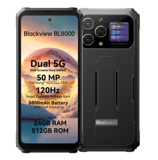Sotto il cofano, il BL8000 è alimentato da un processore 5G MediaTek Dimensity 7050 Octa-core da 6nm, supportato da fino a 12GB di RAM DDR5 e 512GB di ROM su performanti memorie UFS3.1. Il dispositivo offre prestazioni 5G eccezionali e supporta Wi-Fi 6 dual-band, garantendo connettività veloce e affidabile. Inoltre, è dotato di una batteria da 8,800mAh con ricarica rapida da 33W, ideale per chi è spesso in movimento.