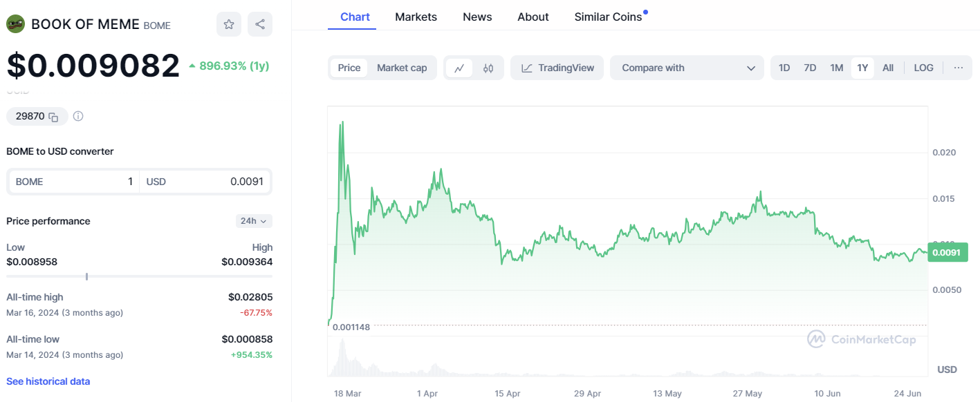 Infatti, a marzo, BOME era una meme coin con una capitalizzazione di mercato di un miliardo. Ora, la capitalizzazione di mercato è di circa 600 milioni di dollari. Detto questo, questo è ancora sufficiente perché BOME sia considerata una delle migliori meme coin a livello globale.