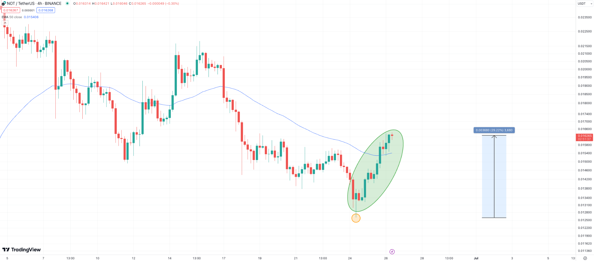 Il folle viaggio di Notcoin continua questa settimana. Dopo aver subito un brutale crollo del 39% la scorsa settimana, toccando il fondo a $ 0,0125 questo lunedì, NOT ha messo in scena un ritorno a sorpresa.