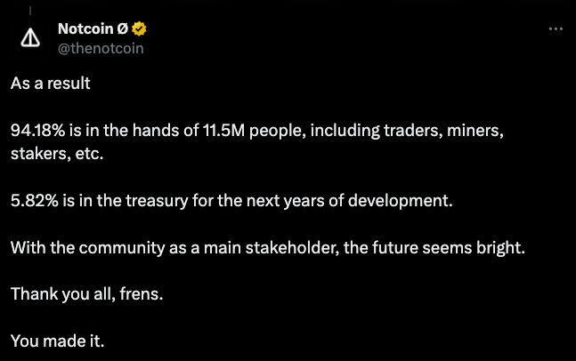 Queste decisioni hanno rimodellato la tokenomics di Notcoin e creato ulteriore scarsità. Con un’offerta circolante di 102,4 miliardi e una capitalizzazione di mercato di 1,6 miliardi di dollari, NOT si è consolidata come la 52a criptovaluta più grande del mondo.