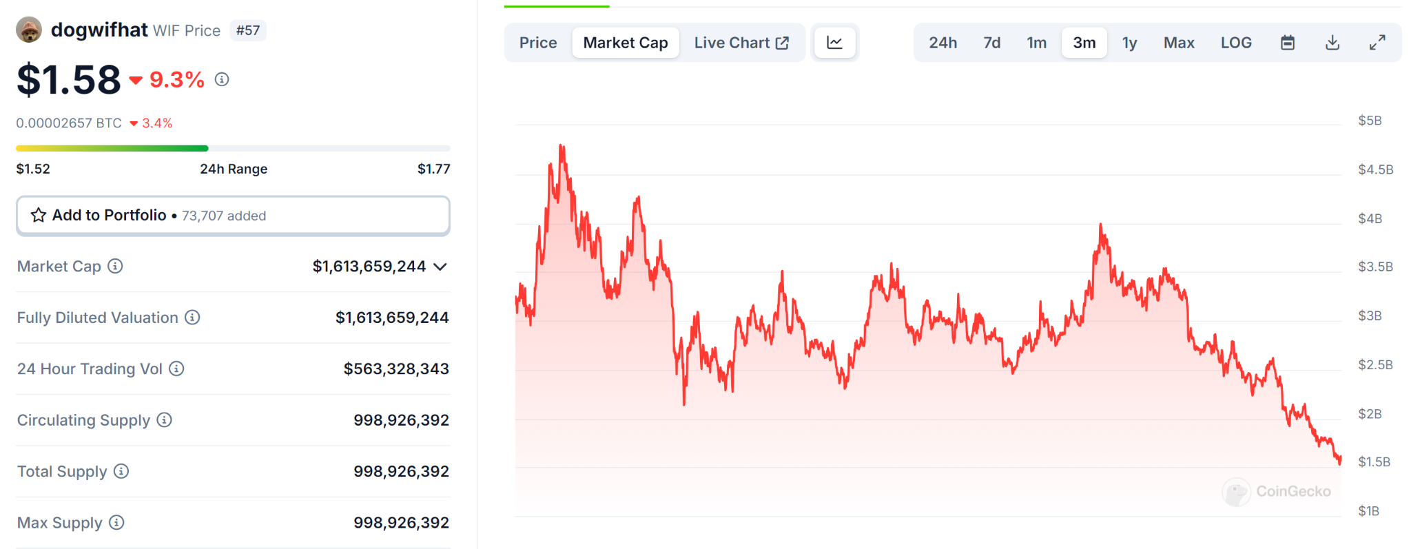 Ad esempio, Dogwifhat ha subito una correzione di oltre il 40% negli ultimi 30 giorni e attualmente viene scambiato a poco più di $ 1,50. La valutazione della meme coin Solana è attualmente pari a 1,6 miliardi di dollari, in calo di quasi 3 miliardi di dollari rispetto al picco di aprile.