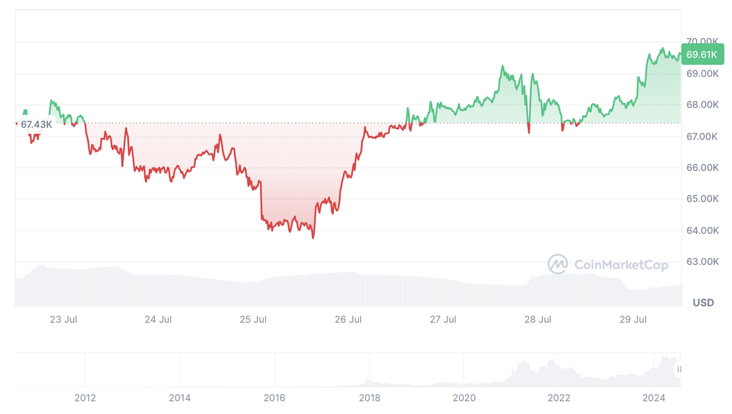 BTC viene attualmente scambiato a 67.500$, in crescita del 1% questa settimana, con una capitalizzazione di mercato di 1,3 trilioni di dollari e un volume di scambi di 32 miliardi di dollari nelle 24 ore.