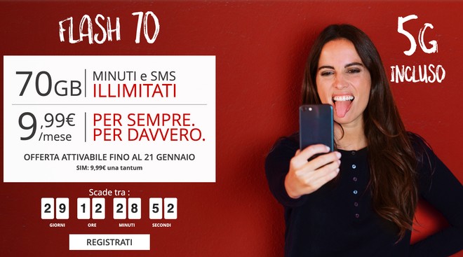 Iliad ha promosso oggi tramite la propria pagina Facebook la nuova offerta Iliad Flash 70, la sua prima con 5G incluso. La proposta è dedicata ai nuovi clienti che attivano una SIM o che effettuano la portabilità del numero entro il 21 gennaio, salvo proroghe.