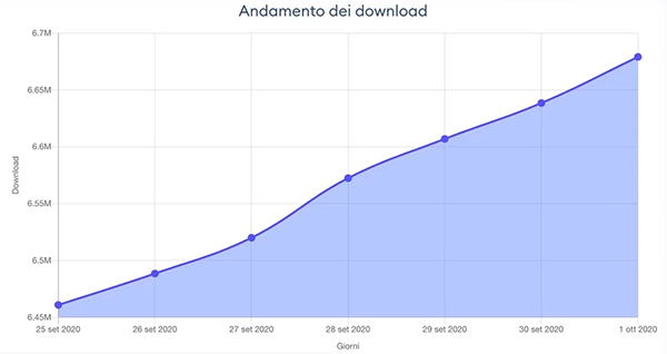 Com’è possibile vedere nell’immagine sovrastante, i dati sono aggiornati al 1 ottobre 2020 e mostrano quasi 7 milioni di download complessivi. 6.679.118, per l’esattezza.