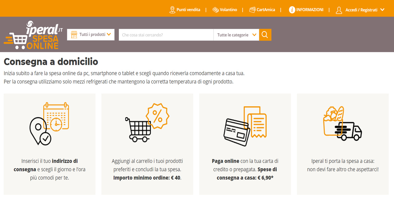 Con l’intenzione di migliorare l’esperienza d’acquisto del cliente, l’azienda ha aperto le porte all’e-commerce. Fare la spesa sul sito internet di IPERAL è semplice: è possibile comperare e ritirare il tutto presso il punto vendita che l’utente preferisce, senza code e senza attese, oppure farsi recapitare tutto a casa. Basta entrare nel portale di IPERAL Spesa Online e iniziare subito a fare la spesa da PC, smartphone o tablet.