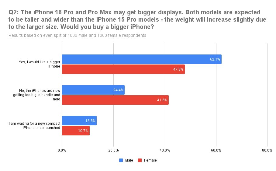 Andando a capire meglio queste cifre dividendo le risposte tra uomini e donne, gli uomini vogliono maggiormente un iPhone più grande rispetto alle donne, con il 62,1% contro il 47,8%. Tuttavia, il 41,5% delle donne ha affermato che gli iPhone stanno diventando troppo grandi, contro il 24,4% delle risposte maschili.