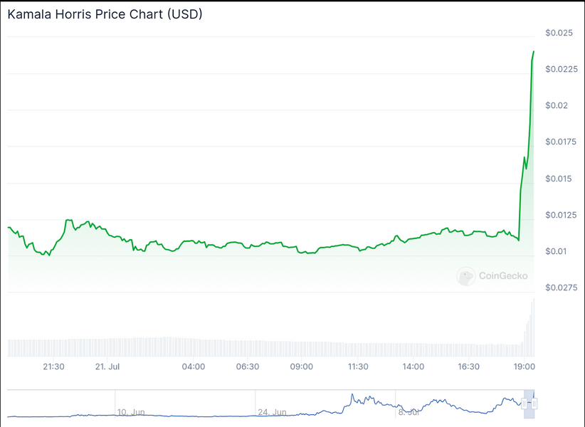 La meme coin Kamala Horris (KAMA) è salita del 110,4%, scambiata a $ 0,02403, con una capitalizzazione di mercato che riflette la sua valutazione completamente diluita di $ 23.921.482. La performance di questa moneta evidenzia la crescente fiducia degli investitori nel futuro politico di Harris.