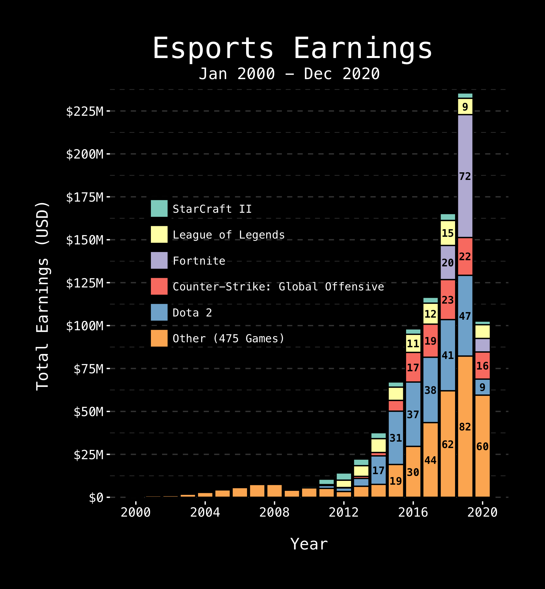 Una passione che fino a qualche mese fa ha avuto un impatto positivo sulla categoria, dall’incremento dei guadagni degli atleti (nel grafico, quelli derivanti dai premi in denaro nei tornei), fino a quelli delle città che ospitano le manifestazioni. Basti pensare che una delle tappe più importanti della nuova League of Legends ha generato poco più di un anno fa circa 2.4 milioni di euro di introiti per la città di Rotterdam.