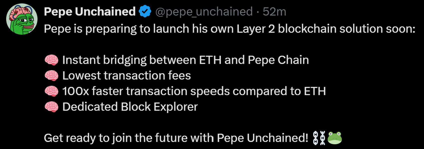 Anche Pepe Unchained è entrato in questa competizione, con una svolta innovativa che lo distingue dal resto della folla. Il progetto è destinato a lanciare la propria blockchain Layer-2, che mira a fornire bassi costi di negoziazione, transazioni più veloci e ricompense di staking elevate.