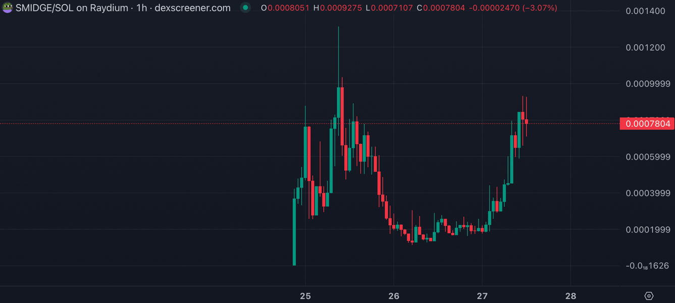 La meme coin a tema Pepe, Smidge, sta esplodendo con il suo prezzo in aumento di oltre il 150% nelle ultime 24 ore.