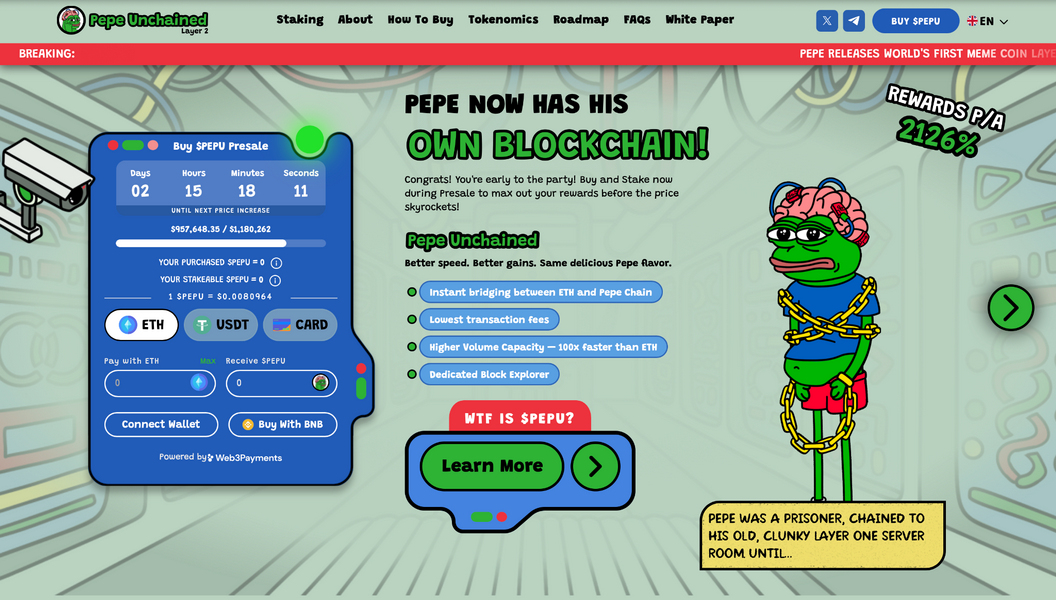 Pepe Unchained è attualmente disponibile a $ 0,0080964, ma il suo prezzo aumenterà durante la prevendita, con il prossimo incremento previsto tra due giorni. I token possono essere acquistati utilizzando ETH, USDT o carta di debito o credito.