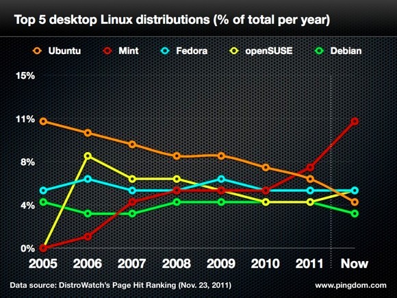 Il declino di Ubuntu, del resto, risulta piuttosto visibile in un grafico pubblicato da Royal Pingdom, il quale mette in luce come dal 2005 ad oggi la percentuale d’uso della distribuzione “per esseri umani” sia stata caratterizzata da un andamento costantemente in ribasso. Il sorpasso si è avuto nel corso del 2011, quando Mint è riuscita ad imprimere una sensibile accelerazione raggiungendo circa l’11% del mercato Linux.