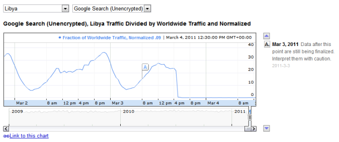 I dati forniti da Google Transparency non lasciano infatti scampo a dubbi: il Paese libico è irraggiungibile da alcuni giorni, con i cittadini isolati dal resto del mondo. A differenza di quanto accaduto in Egitto, però, la situazione sembra leggermente diversa: se il blocco delle connessioni imposto ai provider da parte del Governo libico rendeva impossibile raggiungere i server locali, quelli inviati verso i server libici riescono a raggiungere la destinazione per poi sparire. Ogni tentativo di contatto verso la Libia non fornisce dunque risposta, confermando le ipotesi di un blocco delle attività.