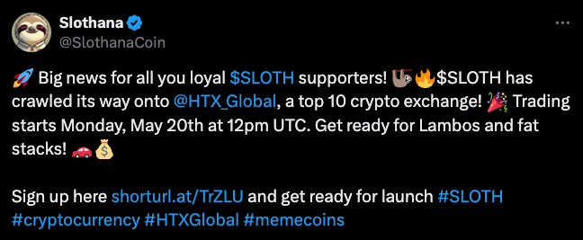 Con oltre 500 token disponibili, essere quotati su un exchange di primo livello come HTX è un’importante conferma del potenziale di Slothana – e un segno che il token sta guadagnando molta popolarità.