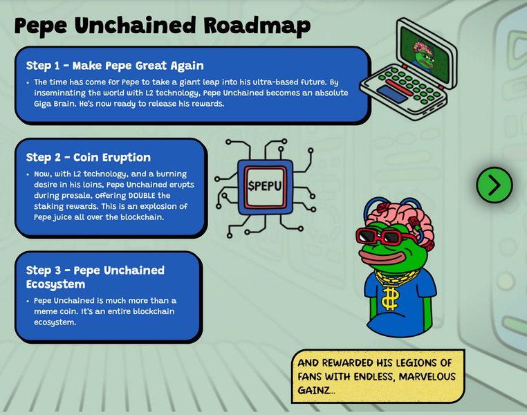 Ad esempio, potrebbero creare NFT di meme o costruire protocolli di finanza decentralizzata (DeFi) attorno ai personaggi dei meme più popolari. La piattaforma ha anche un piano chiaro e una tabella di marcia per il futuro, come delineato nel white paper di Pepe Unchained.