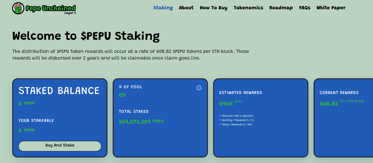 A complemento della sua utilità della catena di livello 2 c’è il suo modello di staking standard, che consente ai primi acquirenti di assaporare ricompense redditizie impegnando i propri token nel suo pool di liquidità. Al momento in cui scriviamo sono stati messi in stakgin oltre 269 milioni di $PEPU. Con un sostanziale 30% della sua offerta totale dedicata allo staking, Pepe Unchained ha dimostrato la sua posizione incentrata sulla community.