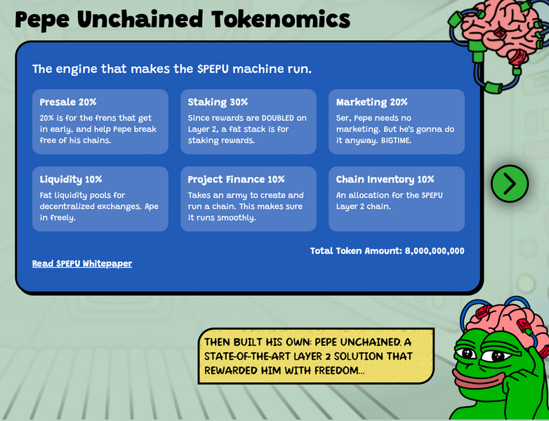 Mentre il 20% dei token Pepe Unchained è allocato alla prevendita, il 30% è destinato allo staking. Ciò significa che per ogni token che gli investitori acquistano in prevendita, 1,5 extra sono in palio tramite ricompense di staking.