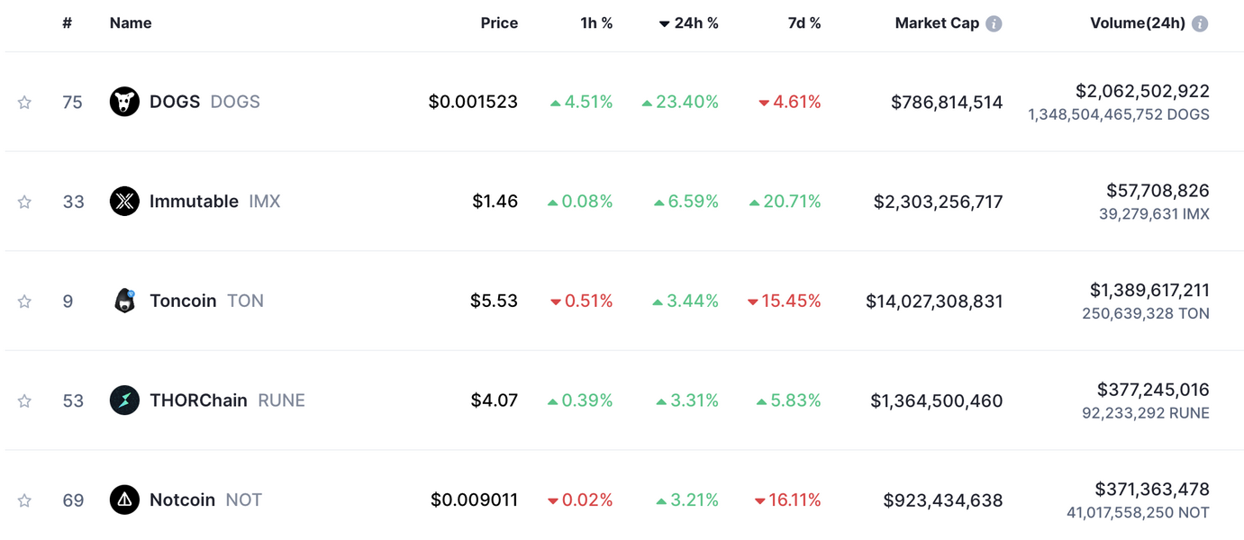 Quasi ogni giorno, sembra che una meme coin guidi la lista dei migliori gainer di CoinMarketCap. Oggi, è Dogs con un rialzo del 23%.