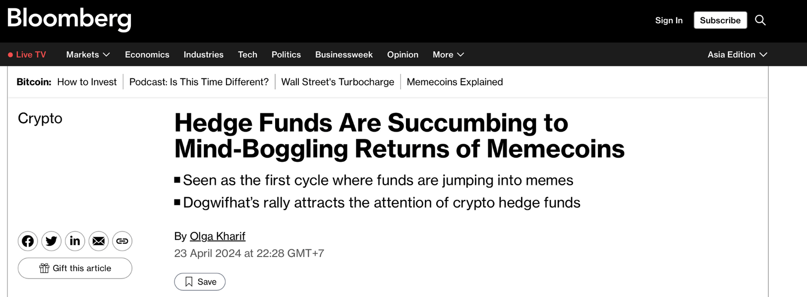 Bloomberg ha rivelato per la prima volta questa idea ad aprile, sottolineando che le meme coin come Dogwifhat stanno rubando la scena a Bitcoin.