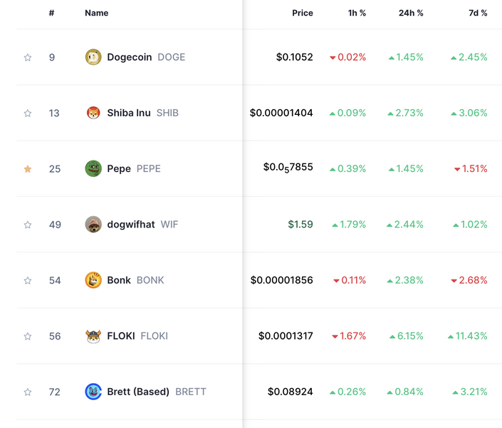 Grandi nomi come Dogecoin, Shiba Inu, Pepe e Dogwifhat sono tutti in territorio positovo, ma i veri guadagni si stanno verificando con le meme coin meno note.