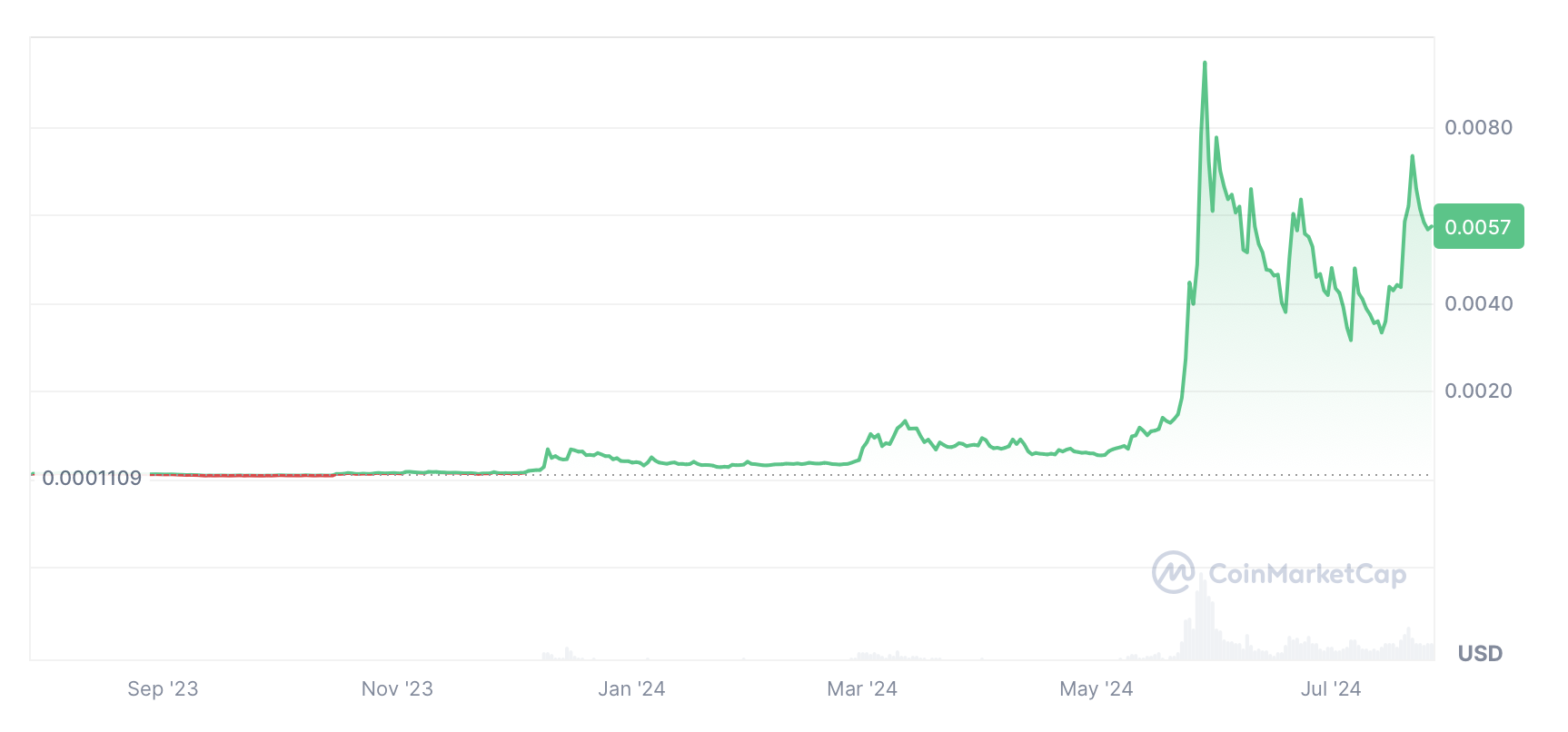 Prendiamo Turbo. Quest’anno ha registrato un’impennata del 5.000% ed è ora una delle 15 principali meme coin. All’inizio di questa settimana è stata anche la criptovaluta di maggior tendenza su CoinMarketCap.