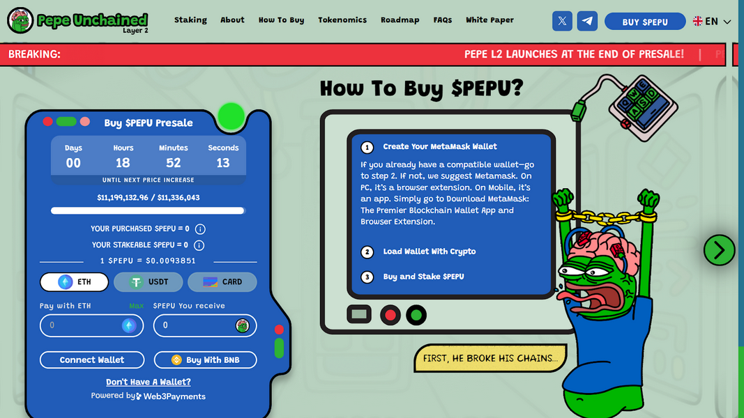 Finora, Pepe Unchained ha raccolto oltre $ 11,1 milioni dalla sua prevendita, con un $PEPU attualmente a un prezzo di soli $ 0,009385. Gli investitori interessati a questo progetto e che desiderano acquistare il token Pepe Unchained possono visitare la pagina di prevendita qui sotto.