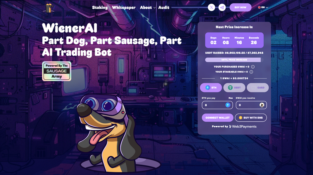 Come suggerisce il nome, WienerAI è una miscela di meme coin e criptovaluta AI. Ha l’esterno di una meme coin con una giocosa mascotte di un cane salsiccia, ma lo scopo principale del progetto è un bot di trading AI.