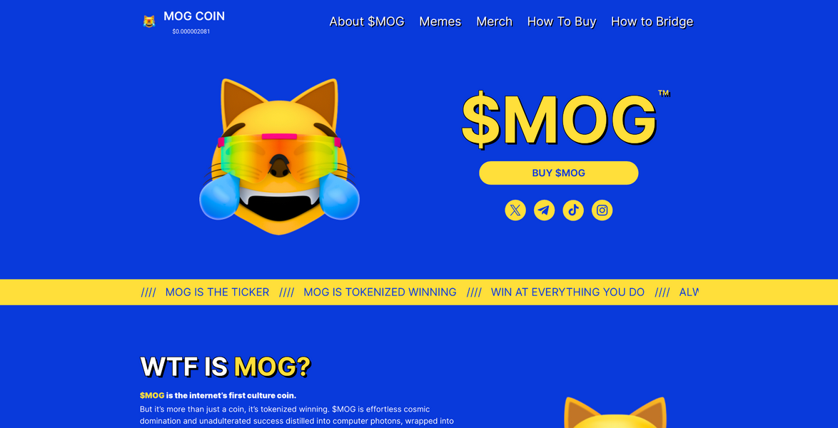 La mascotte di Mog Coin è un gatto che ride mentre guarda lo schermo. C’è persino un’emoji corrispondente che è diventata popolare tra i fan delle monete meme e la più ampia base di utenti di Internet.