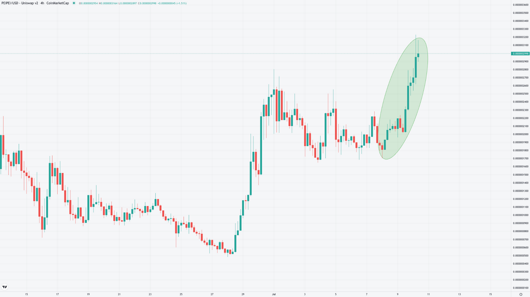 Dopo aver oscillato lateralmente per alcuni giorni, PEIPEI è balzato a 0,0000003$. Oggi il token ha addirittura toccato un nuovo massimo storico prima di arretrare leggermente.