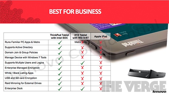 Il produttore cinese Lenovo decide di puntare forte su Windows 8: lo dimostrano gli ultimi documenti trapelati, che parlano della nascita del ThinkPad Tablet 2, dispositivo con architettura Intel che monterà proprio l’ultimo sistema operativo di Redmond. Non c’è ancora un annuncio ufficiale da parte dell’azienda, me le specifiche tecniche sono già note grazie alle slide leaked, e a questo punto è lecito attendersi una comunicazione in tal senso nei prossimi giorni.