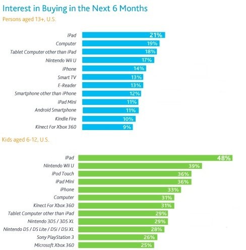 Diversa, invece, la situazione nei sondaggi condotti su un campione avente tredici anni o più: l’iPad è infatti sempre al primo posto, ma con una percentuale del 21%.