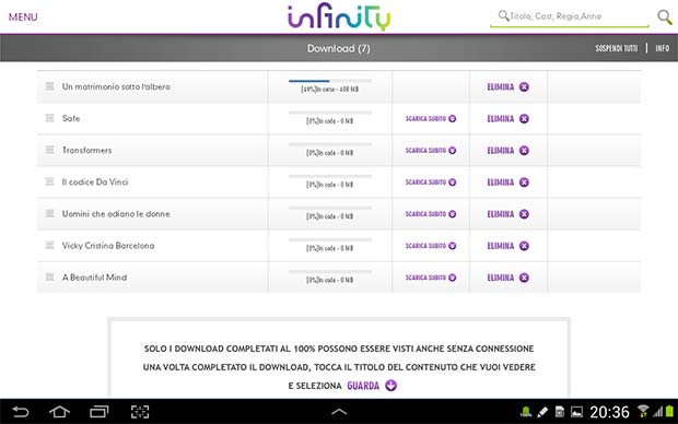 Basta dunque un tap sull’icona “Cast" visualizzata nell’angolo superiore destro dell’interfaccia e i contenuti caricati sul proprio smartphone o tablet saranno trasmessi istantaneamente sullo schermo del televisore. Va inoltre segnalato che la compatibilità di Infinity con Chromecast è stata introdotta anche per quanto riguarda il sito ufficiale della piattaforma.