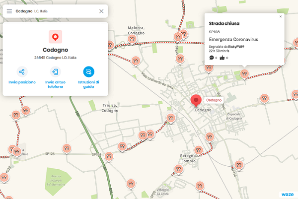 E anche Google, proprietaria di Waze, ha deciso di riportare tutti gli aggiornamenti sulla sua applicazione principale, Google Maps, e su Google Earth. Per esempio, se si controlla Codogno, uno dei primi due focali, si può notare bene la situazione particolare attorno al paese con tutte le vie d’accesso segnate. Per favorire il controllo da parte delle forze dell’ordine, anche alcune vie limitrofe sono state tenute chiuse.