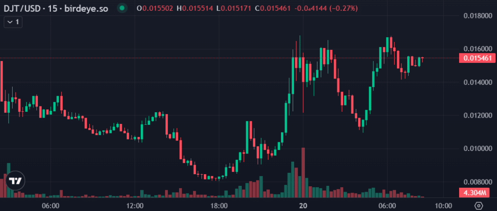 Nonostante questo, la meme coin DJT è aumentata del 29% nelle ultime 24 ore e viene scambiato a 0,015 dollari. La capitalizzazione di mercato dell’asset è attualmente pari a 165 milioni di dollari con un volume di scambi giornalieri di 9 milioni di dollari.