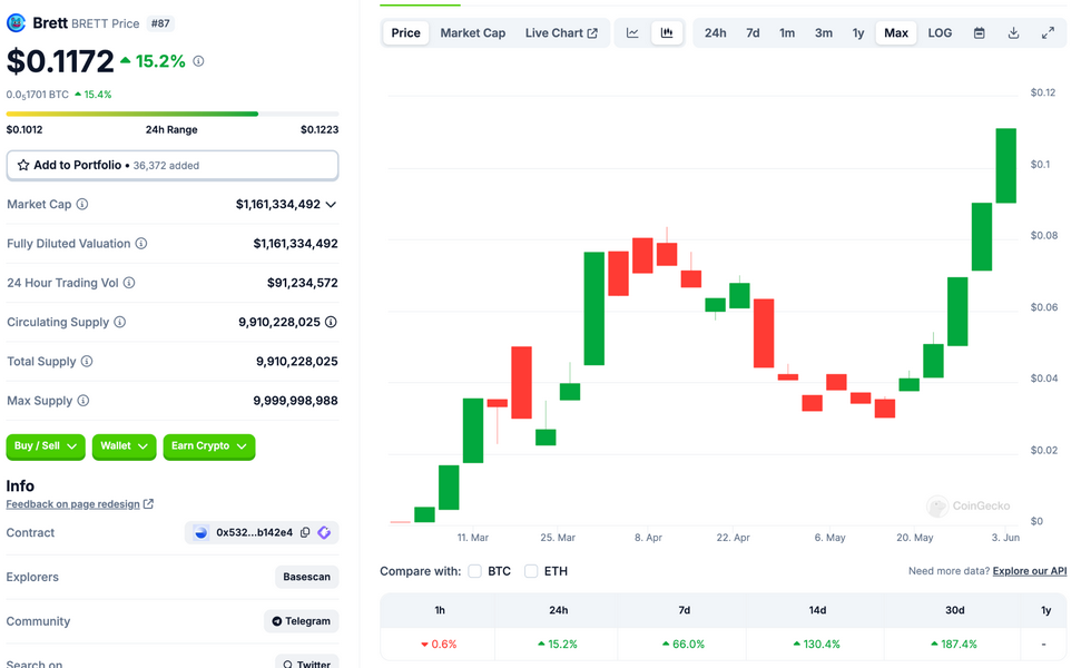 Il $BRETT è ancora scambiato a livelli ben superiori alla capitalizzazione di mercato di 1 miliardo di dollari, stampando un prezzo di 0,1182 dollari, in rialzo del 22% solo nelle ultime 24 ore al momento della stesura di questo articolo (4 giugno).
