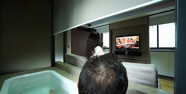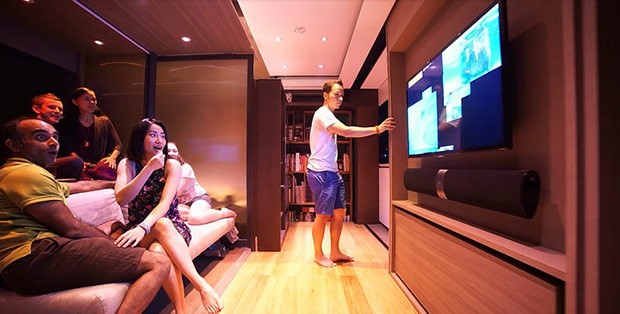 Per ottenere il risultato visibile nel filmato e nelle immagini qui allegate, secondo i responsabili, è stato necessario tenere conto di una quarta dimensione: il tempo. Il posizionamento degli elementi che compongono l’arredamento è pensato per far sì che l’ambiente possa trasformarsi in modo rapido a seconda dei diversi momenti della giornata. Pareti mobili consentono ad esempio di nascondere gli elettrodomestici dietro al televisore, mentre il perimetro della vasca può essere coperto da una rete e da un materasso, dando così vita ad un soggiorno o alla zona letto. I punti luce sono basati su tecnologia LED, con controllo remoto attraverso un’applicazione mobile.