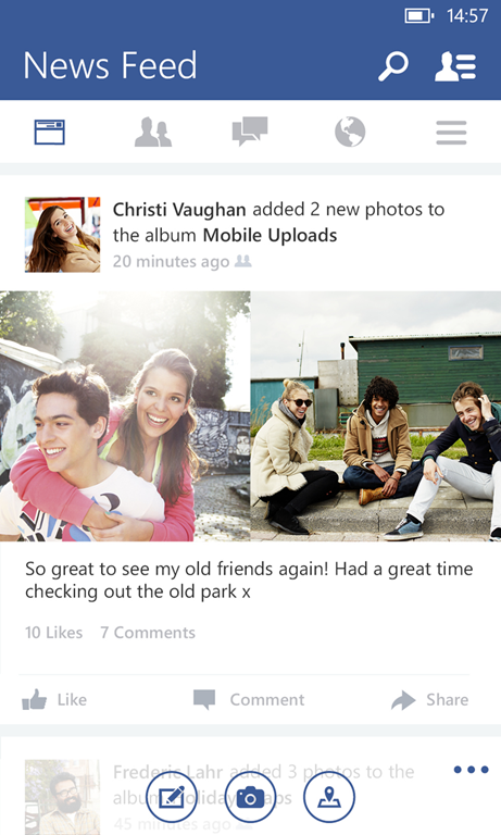 Facebook Beta è riservata agli utenti che vogliono provare in anteprima le nuove funzionalità, in attesa dell’aggiornamento dell’app ufficiale. Microsoft sottolinea quindi che, come tutti i software beta, potrebbero essere presenti bug o verificarsi malfunzionamenti. L’azienda invita i propri fan a rilasciare un feedback sulla pagina UserVoice dedicata. La novità principale è visibile nella parte superiore dello schermo. Qui sono stati inseriti un banner News Feed, il pulsante per la ricerca e l’elenco dei contatti online.
