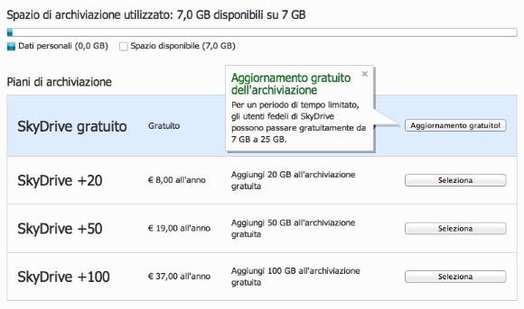 Le novità in arrivo da Redmond non riguardano poi solamente il lato software, ma anche i servizi messi a disposizione dalla società, la quale ha introdotto una serie di piani a pagamento che permettono di andare oltre i 7 GB offerti gratuitamente a tutti gli utenti. In tal senso le offerte prevedono un canone da 8 euro l’anno per ottenere 20 GB aggiuntivi, 19 euro per 50 GB e 37 euro per 100 GB, rendendo SkyDrive uno dei prodotti per l’archiviazione nella nuvola maggiormente convenienti in termini di rapporto qualità/prezzo. Per tutti gli utenti iscritti prima dell’annuncio di tali novità, poi, Microsoft offre 20 GB gratuiti, riscattabili semplicemente accedendo al proprio pannello di controllo e cliccando sull’apposito pulsante.