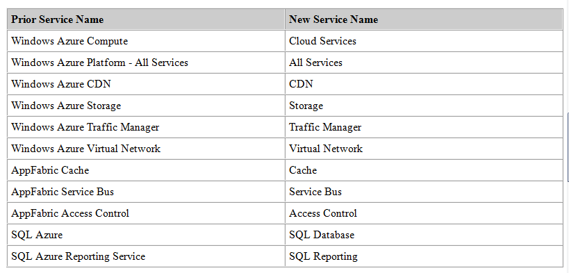 Microsoft non ha pubblicato al momento alcun comunicato stampa in proposito, né un qualsivoglia post su uno dei suoi blog per spiegare in dettaglio questa novità, per cui sembra molto probabile che i nuovi nomi siano riferiti solo al portale utilizzato dai clienti per la fatturazione dei servizi. Come si può vedere nella tabella seguente, sono stati eliminati i termini Windows Azure e AppFabric, mentre SQL Azure e SQL Azure Reporting Service sono stati rinominati, rispettivamente, in SQL Database e SQL Reporting.
