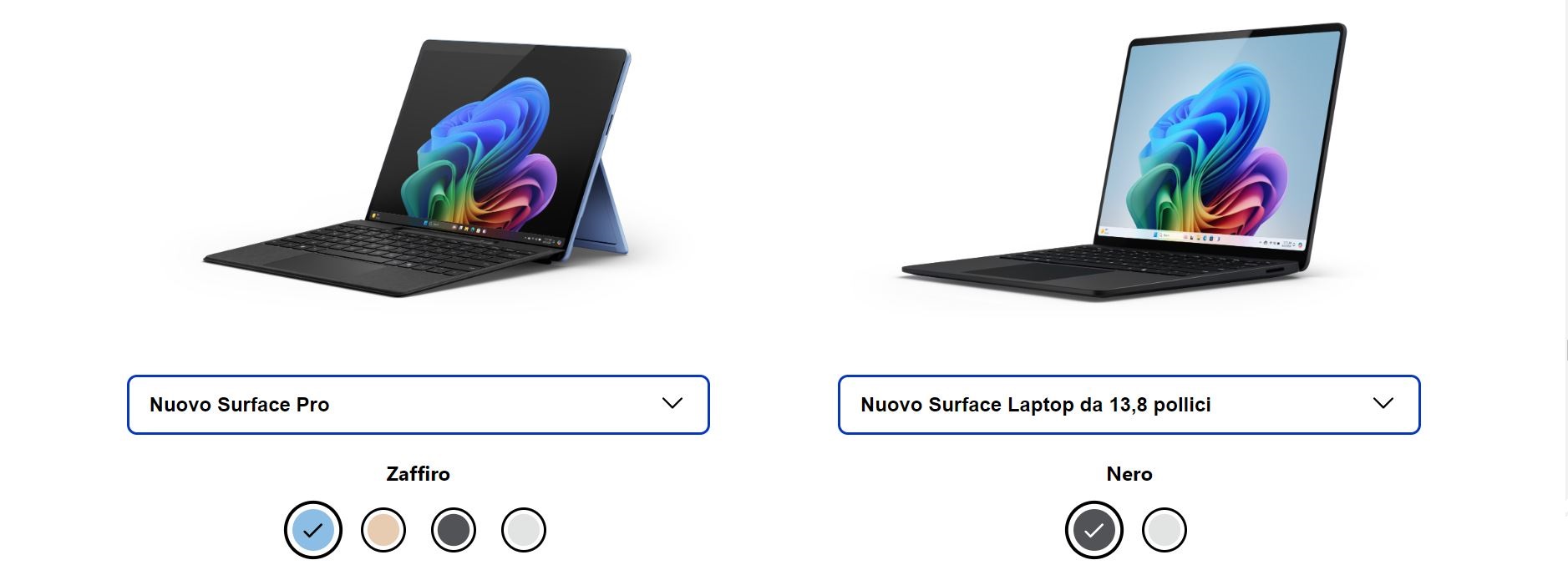 Diversi i colori e diversi i tagli, da 13,8 a 15 pollici touch. Prezzi a partire da 1229 euro sino a 2529 euro, a seconda ovviamente delle specifiche, con i modelli più costosi che includono la CPU Snapdragon X Elite al posto della Plus. Surface Pro, tablet ibrido, avrà un pannello 13 pollici HDR Oled sui modelli top di gamma e anch’esso una CPU Snapdragon X, Plus o Elite a seconda della fascia di prezzo.