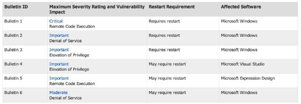 Gli altri cinque bollettini in arrivo la prossima settimana si suddividono in quattro etichettati come importanti ed uno come moderato. I primi risultano anch’essi legati all’esecuzione di codice da remoto, benché in tale caso il rischio sia sensibilmente più basso rispetto alla falla ritenuta critica dagli esperti di sicurezza Microsoft, costantemente all’opera per sfornare patch in grado di proteggere gli utenti. Le problematiche riguardano inoltre la possibilità di ottenere privilegi da remoto senza l’autorizzazione dell’utente ed attacchi DoS.