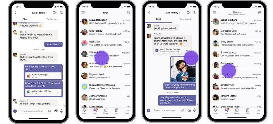 Gli utenti potranno chattare e organizzare call e videocall sfruttando un’ampia possibilità di condivisione: dai contenuti più divertenti, come le GIF animate, alla possibilità di inviare foto, video e la propria geolocalizzazione. Non solo: Microsoft Teams permette anche di usufruire di una dashboard intuitiva per condividere liste, documenti e calendar sia con i propri gruppi, sia all’interno delle singole conversazioni.