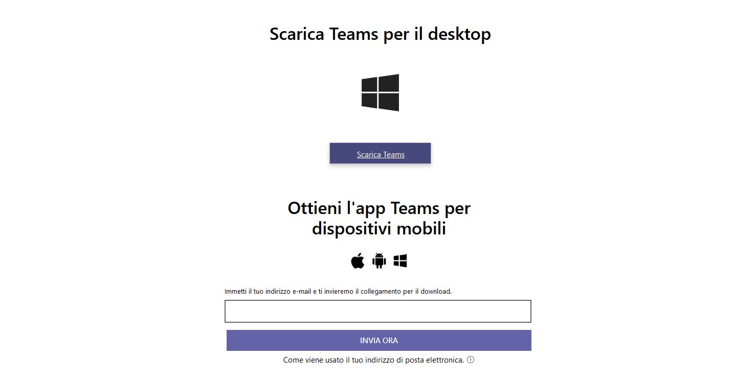 Andiamo su questo sito e nell’area Scarica Teams per il desktop clicchiamo su Scarica Teams. Si avvierà in automatico il download di un file eseguibile di circa 93 MB. Nella stessa sezione è possibile fornire il proprio indirizzo email in modo da ottenere direttamente nella propria casella di posta elettronica il link per il download della versione di Microsoft Teams per dispositivi mobili.